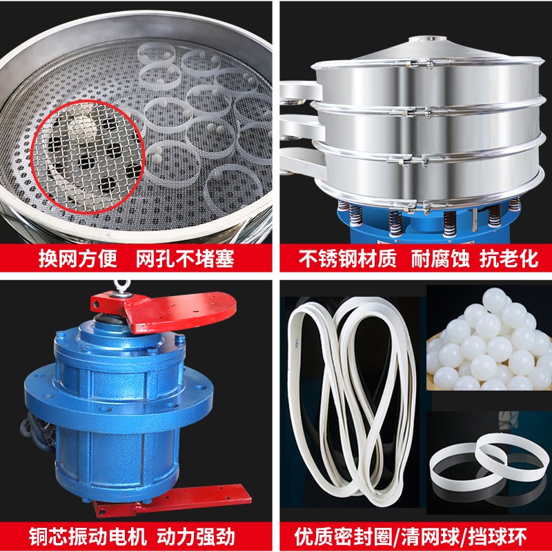 任何顆粒、粉末、粘液一定范圍內(nèi)均可篩選。篩分細(xì)至500目或0.028mm, 過濾小可至5微米。分級篩選,可篩一至五層篩網(wǎng),能同時進(jìn)行二至六個等級的分選或過濾。