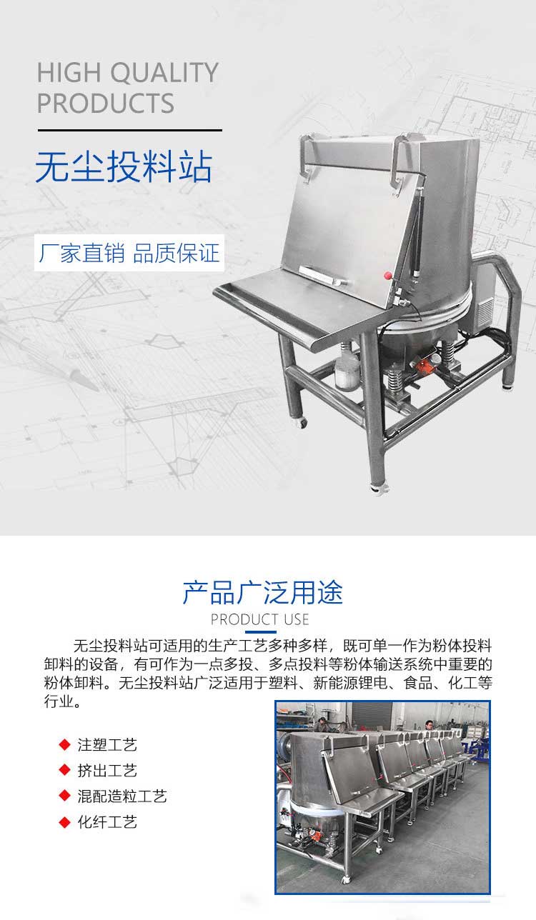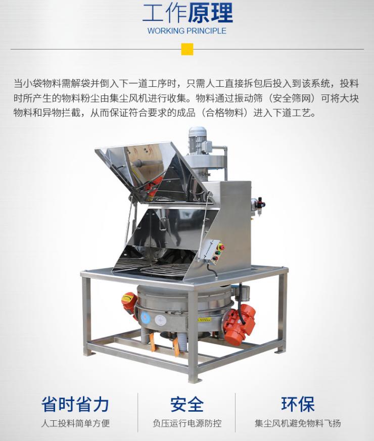 拆包時由于集塵風(fēng)機(jī)的作用,可以避免物料粉塵到處飛揚。
