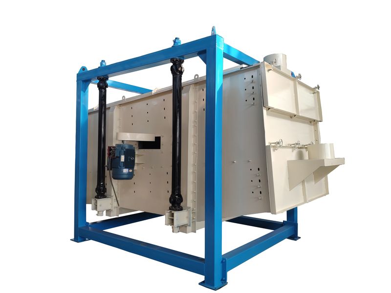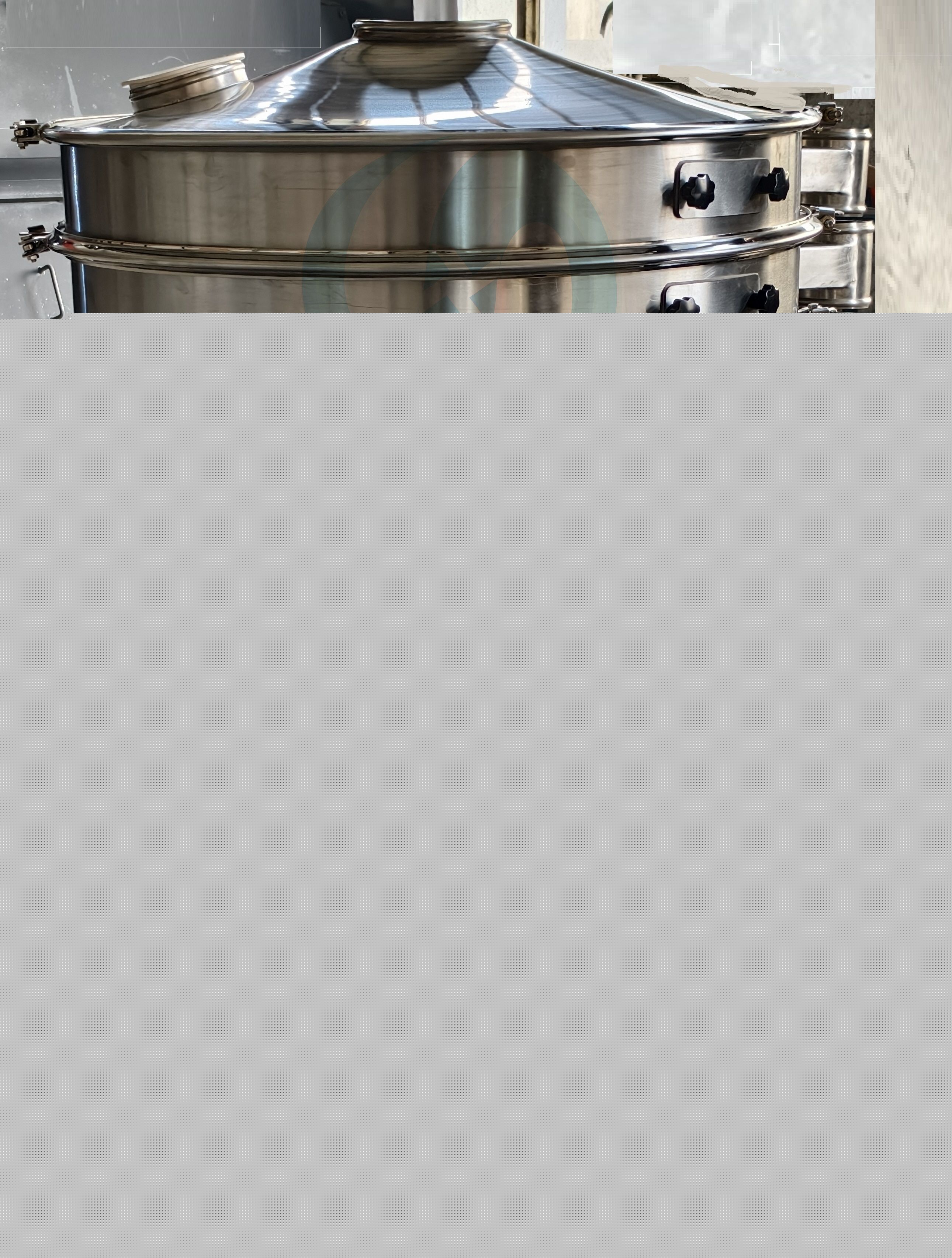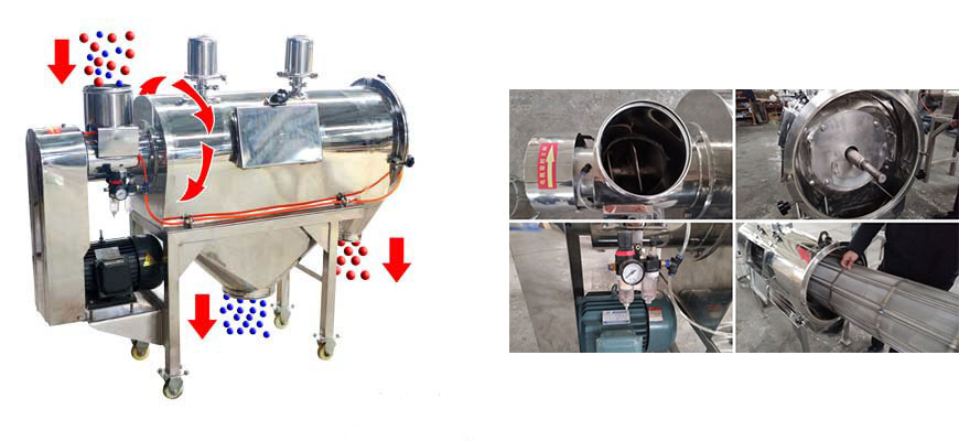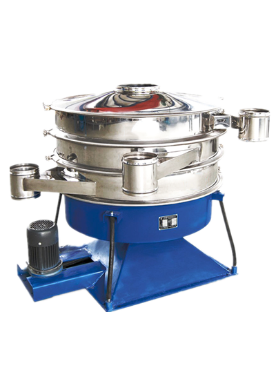 本設(shè)備篩網(wǎng)為圓筒狀,置于機(jī)體內(nèi),物料通過螺旋輸送系統(tǒng)后與氣流混合、霧化進(jìn)入網(wǎng)筒內(nèi),通過網(wǎng)筒內(nèi)風(fēng)輪葉片使物料同時(shí)受到離心力和旋風(fēng)推進(jìn)力,從而使物料噴射過網(wǎng),過網(wǎng)的物料從細(xì)料排出口排出,不能過網(wǎng)的物料沿筒壁從粗料排出口排出,達(dá)到快速分離的目的。