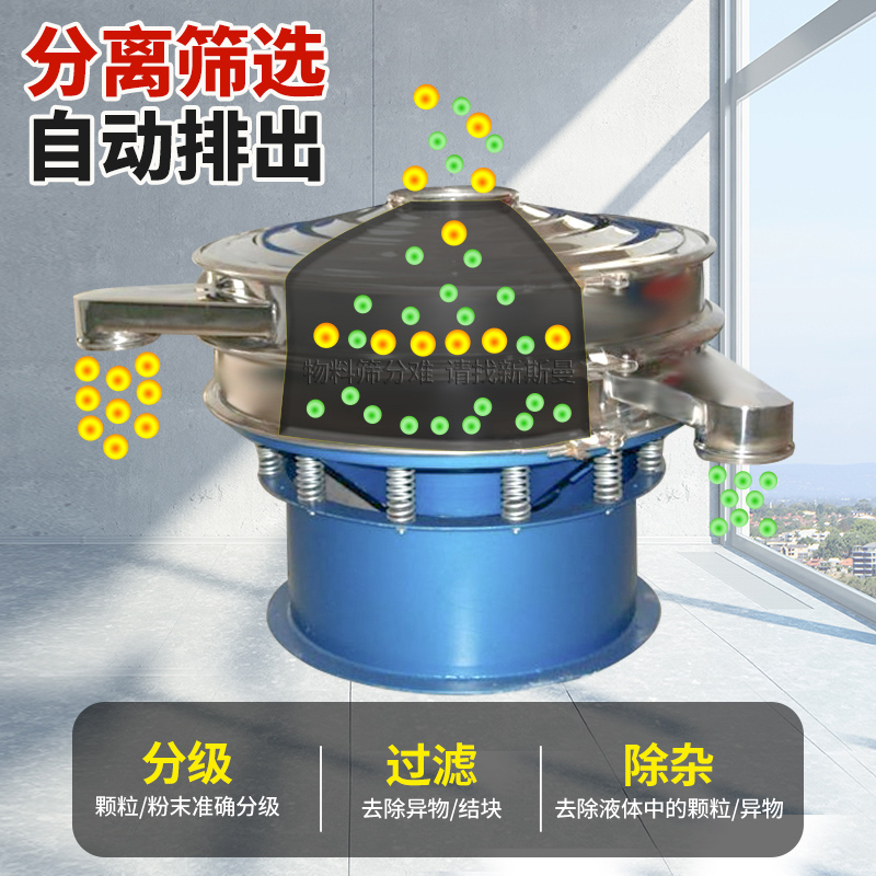 任何顆粒、粉末、粘液一定范圍內(nèi)均可篩選。篩分細(xì)至500目或0.028mm, 過(guò)濾小可至5微米。分級(jí)篩選,可篩一至五層篩網(wǎng),能同時(shí)進(jìn)行二至六個(gè)等級(jí)的分選或過(guò)濾。